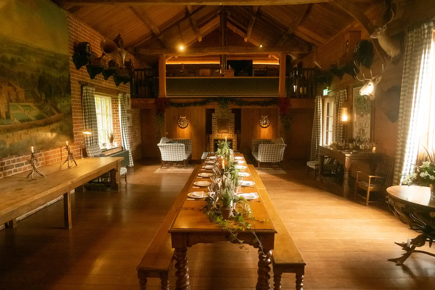 It has a raised stage at one end and a lofted gallery area at the other. It is part of Home Farm, which comprises buildings, spaces, and gardens in the middle of the Estate, overlooking Deer Park and Lake.