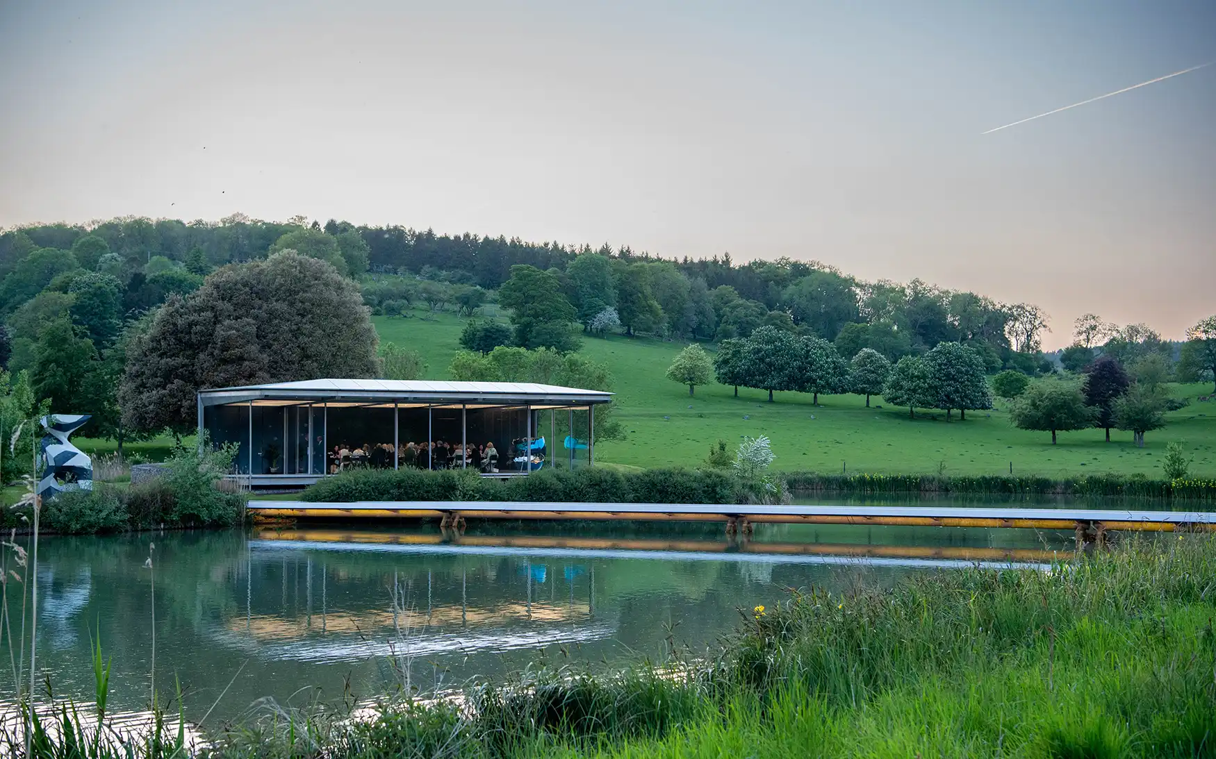 This distinctively simplistic architectural feature is a calm and creative space surrounded by the modern sculptural art on the island accessed via the footbridge over the millpond lake, exuding elegance and serenity.